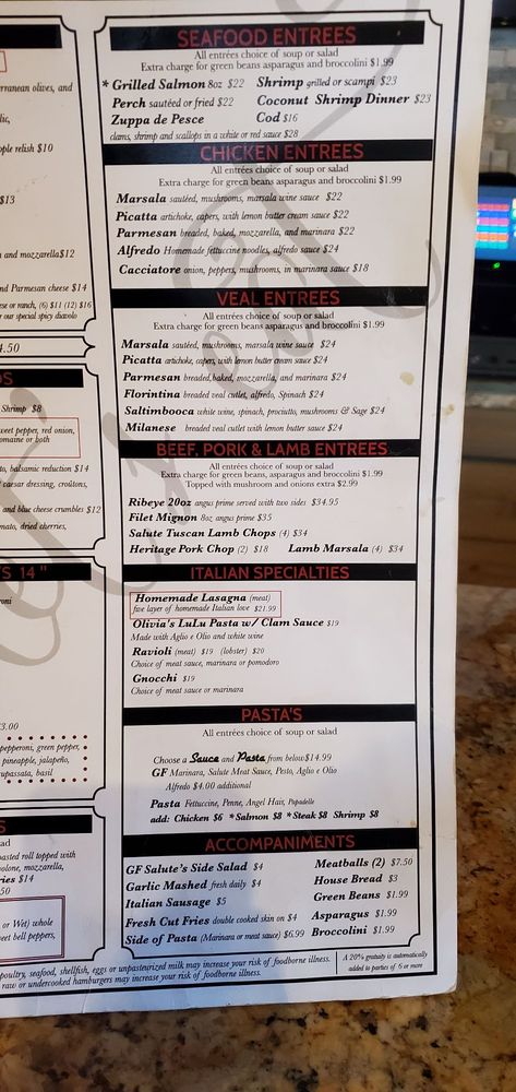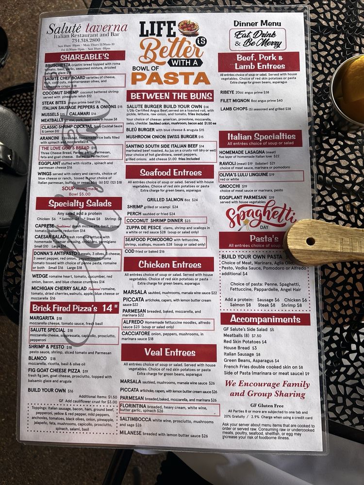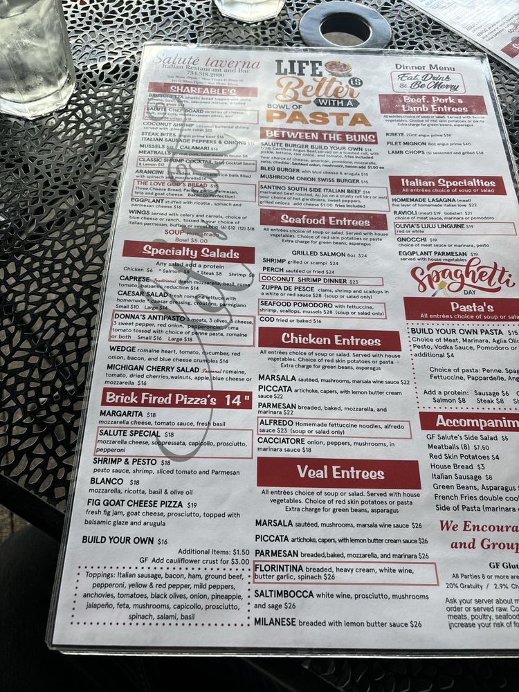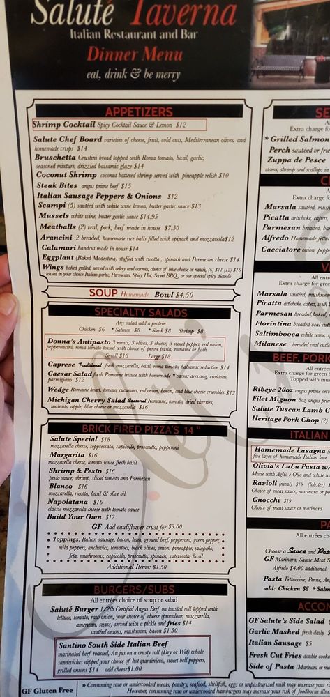 Welcome to Salute Taverna, a delightful Italian gem nestled in Taylor, Michigan. This casual eatery is a perfect blend of classic and contemporary, offering an enticing menu that will whisk you away to Italy. Start your culinary journey with the Salute Chef Board, featuring an array of artisanal antipasti, or savor the succulent Scampi Shrimp sautéed in a zesty wine and lemon blend. For something with a kick, the Famous Shrimp Cocktail is a must-try, complemented by a fiery cocktail sauce.